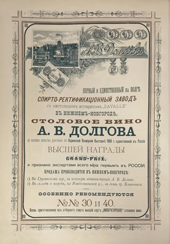 Вторая половина XIX века. Производство водки в России перестает быть кустарным и выходит на новый промышленный уровень. Нижегородская фирма "А. В. Долговъ и К°" удостоена золотых медалей и высших наград на всех русских и иностранных выставках, в т. ч. Барселона (Испания, 1888), Булонь (Франция, 1892). В 1889 год – триумф на Парижской Всемирной выставке. «Столовое вино» А.В.Долгова (водка) было удостоено высшей награды «Grand Prix» и признано Лучшим в России. Завод имеет значительную часть рынка России и его продукция ценится выше именитых конкурентов «Смирновъ», «вдова Попова», «Шустовъ» и др.